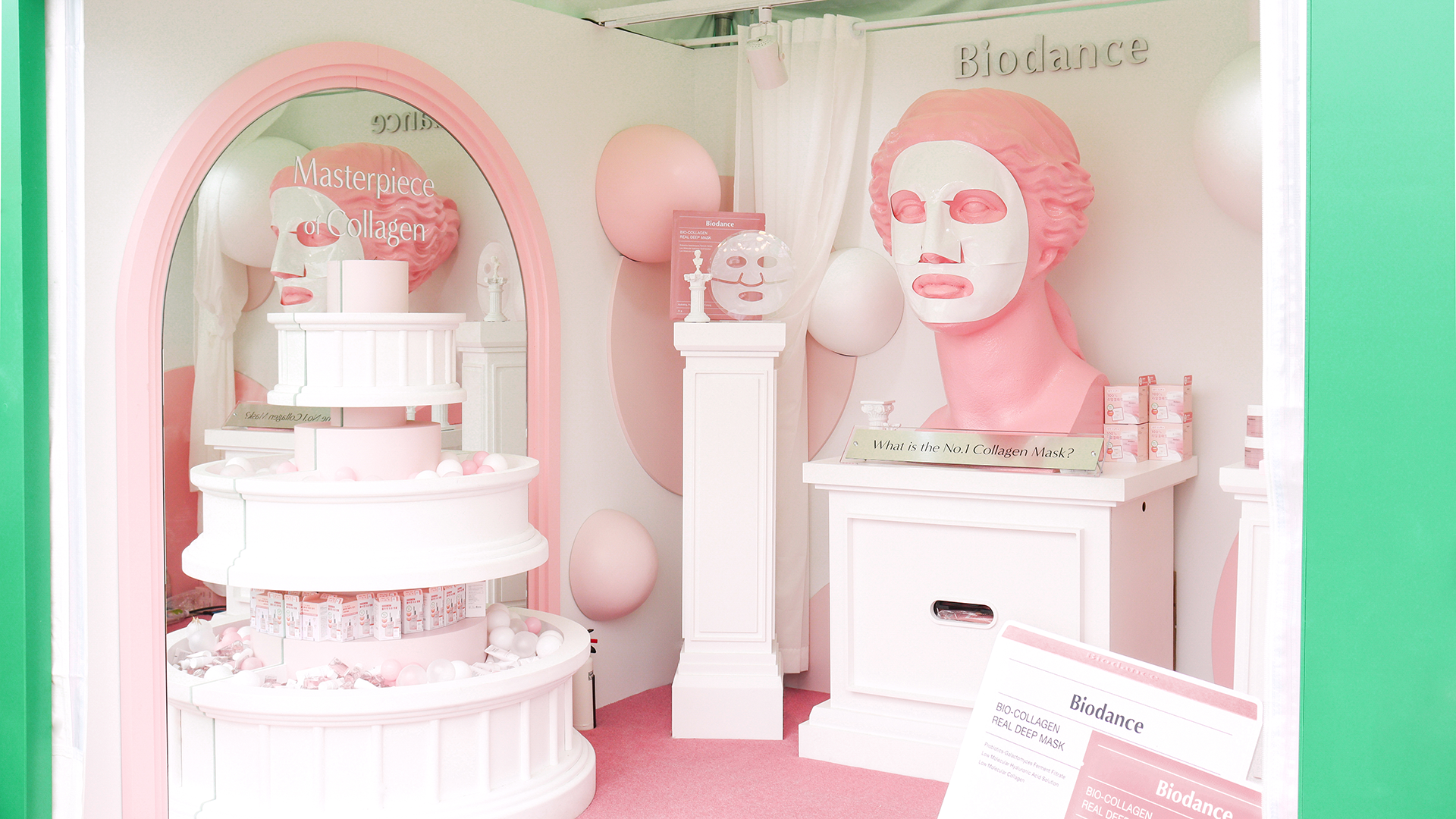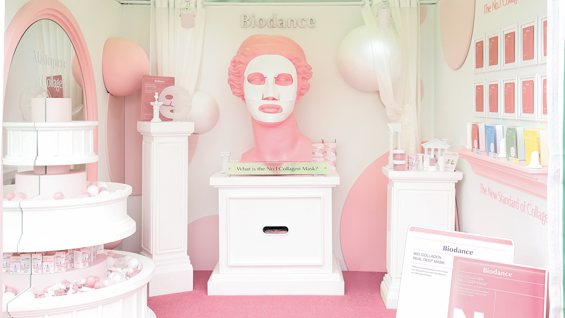 2025 올리브영 페스타의 바이오던스 부스는 ‘콜라겐 신전’을 컨셉으로, 3×3m의 협소한 부스 내에서도 프로모터의 동선을 고려한 효율적인 구성과 배치로 운영 편의성을 높였으며, 거울을 활용하여 공간이 넓어 보일 수 있도록 하였습니다. 여러 부스들이 모여 있는 페스타 특성을 고려하여, 정면에는 마스크팩을 쓴 대형 비너스상 조형물과 콜라겐 분자를 연상시키는 입체 구 형태의 조형물을 배치해 후킹요소로 활용하였고, 핑크 컬러와 신전 컨셉을 드러내는 몰딩 디테일, 또 마스크팩의 질감을 연상시키는 반투명 사틴 아크릴 소재를 활용하여 하나의 통일된 무드로 관람객들에게 각인될 수 있도록 기획하였습니다. 또한 게임형 인터랙션 분수대 집기를 통해 초저분자 콜라겐이라는 제품 USP와 공간 컨셉을 일관되게 전달하였습니다.