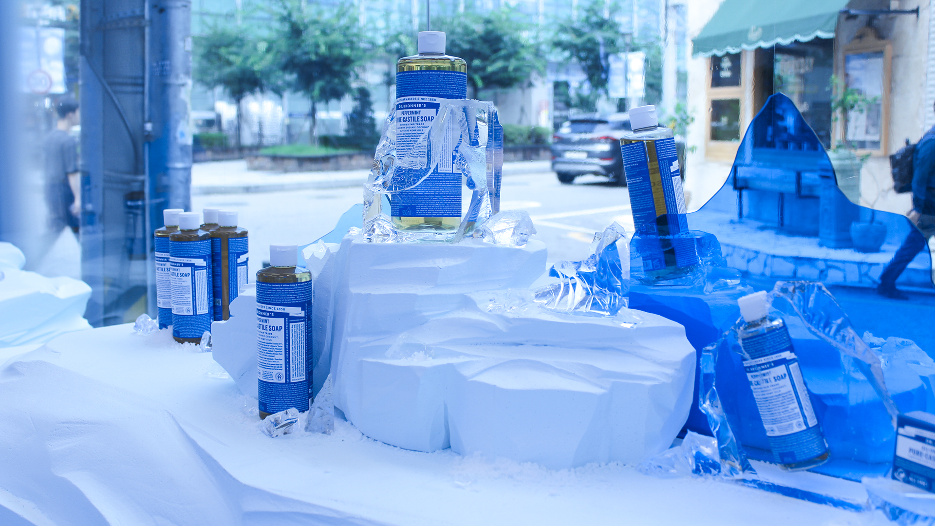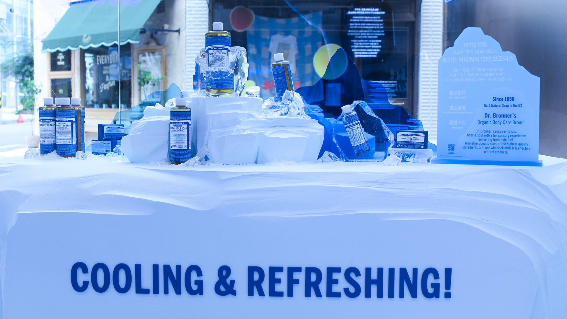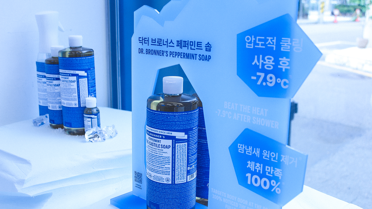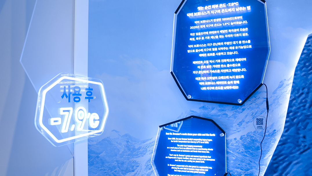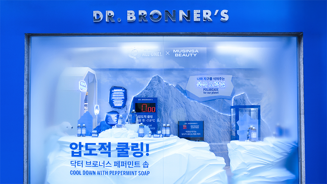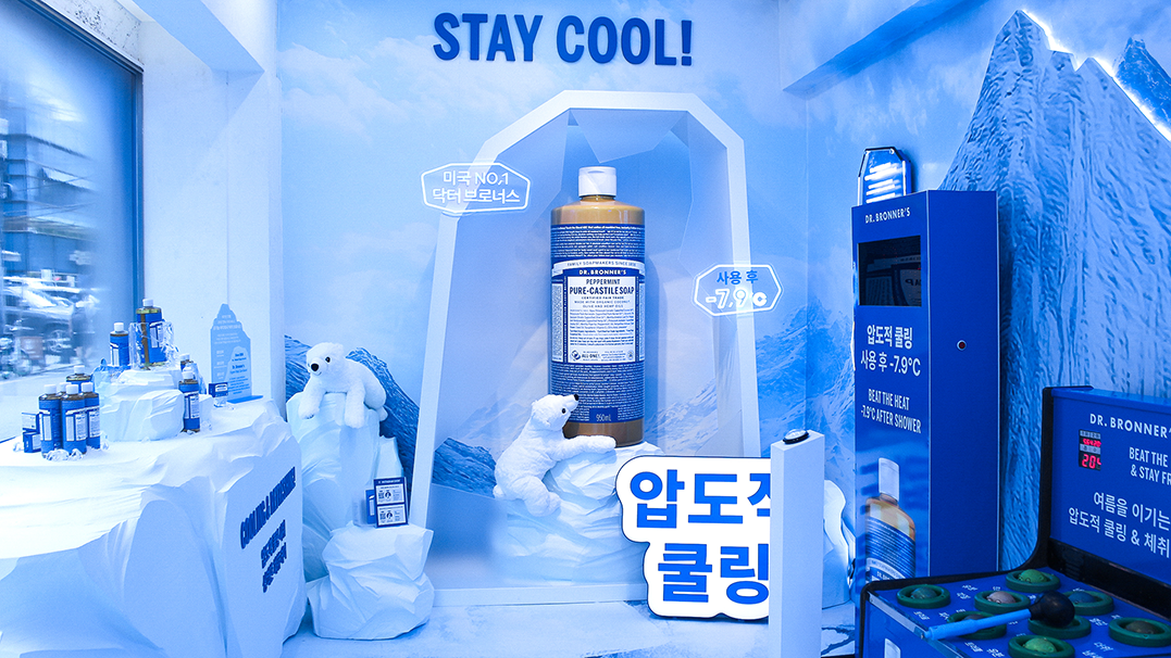 닥터브로너스의 페퍼민트 라인을 오프라인 체험 콘텐츠로 확장하기 위한 ‘북극 오락실’ 콘셉트의 팝업스토어를 기획, 디자인, 제작, 시공했습니다. 페퍼민트 라인의 핵심 USP인 ‘쿨링’을 공간적으로 시각화하기 위해 깨진 빙하 그래픽을 적용한 바닥 연출과 스티로폼으로 직접 제작한 빙하 조형물을 결합해 차가운 북극의 장면을 구축했습니다. 특히 제품이 얼음에 갇힌 듯한 VMD 연출과, 온도 차로 인해 습기가 맺힌 유리창 표현을 더해 현장감과 몰입감을 강화했습니다. 체험 요소들은 제품의 원료 스토리와 자연스럽게 연결되도록 설계해 방문객이 단순한 정보 전달을 넘어 ‘시원함을 체감하는 장면’으로 기억할 수 있도록 구성했습니다. 구조물 제작부터 시각적 연출까지 종합적으로 조율하여, 브랜드의 청량한 무드와 팝업만의 이색적 경험이 균형 있게 드러나는 공간으로 완성했습니다.