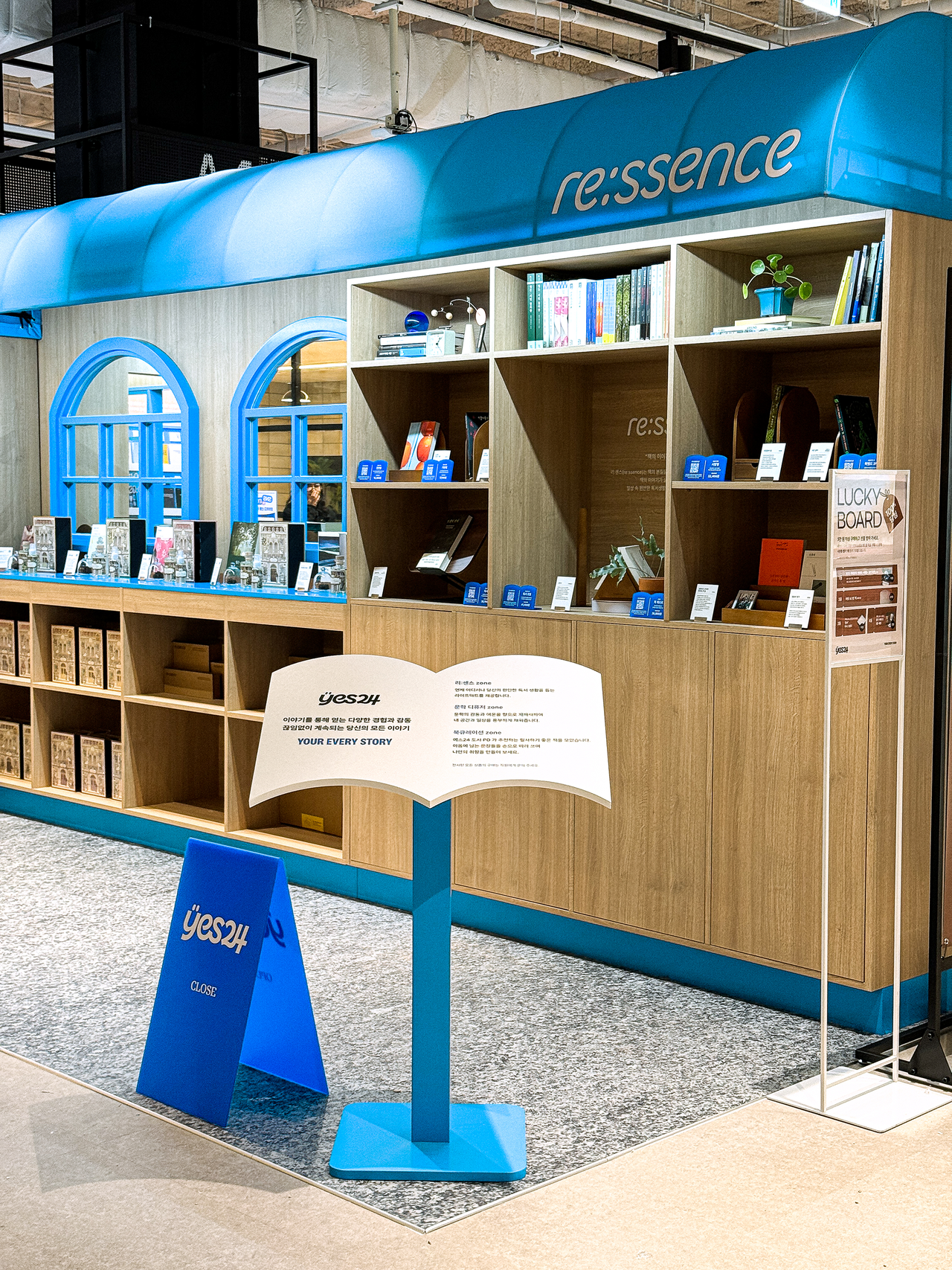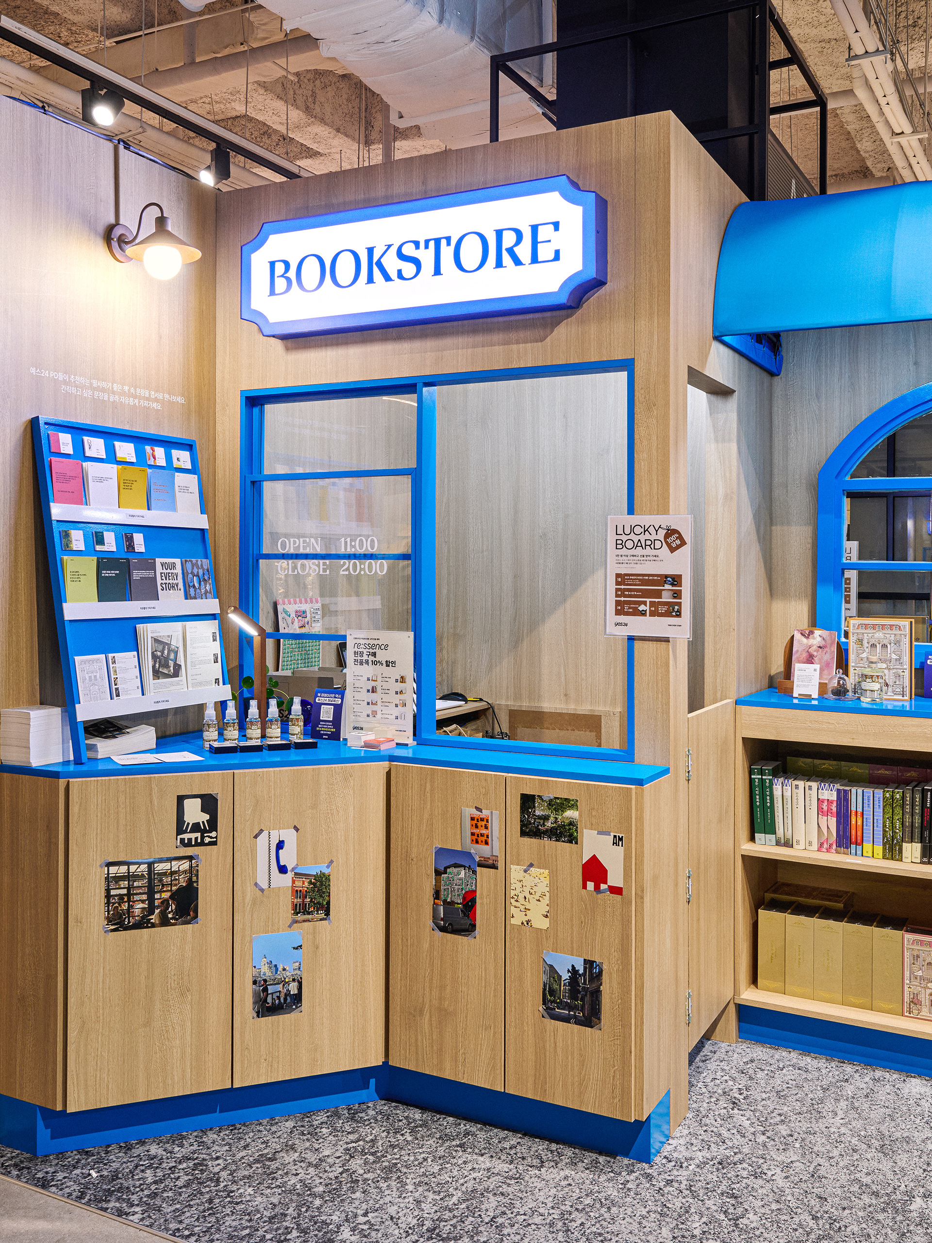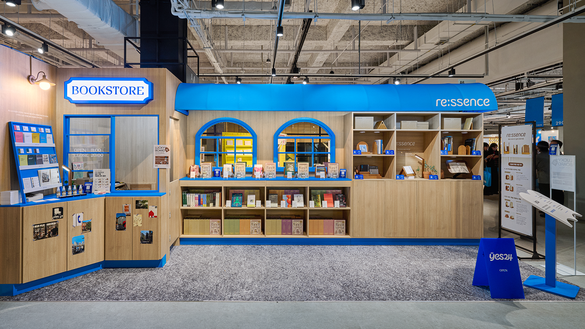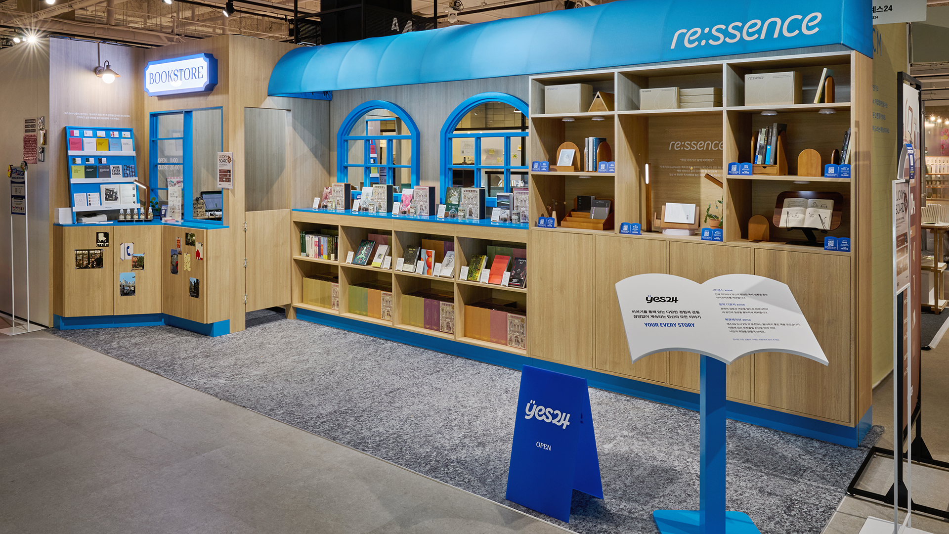 2025 문구페어 인벤타리오에서 ‘나만의 독립서점’을 주제로 예스24의 PB브랜드인 re:ssence의 부스를 기획하고 디자인하였습니다. 문구 중심 브랜드들 사이에서 독서와 일상을 연결하는 브랜드 정체성을 강조하기 위해, 도서 큐레이션과 제품 디스플레이를 유기적으로 연계한 공간을 구성하였으며, 우드 톤 소재와 예스24의 시그니처 블루 컬러를 조화롭게 활용해 따뜻하고 감성적인 무드를 연출했습니다. 북레스트, 독서등, 책꽂이, 디퓨저 등 다양한 제품은 실제 생활 속 독서 경험과 자연스럽게 연결될 수 있도록 배치하여, 브랜드가 제안하는 독서 솔루션을 직관적으로 경험할 수 있는 공간으로 완성하였습니다.